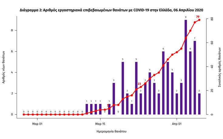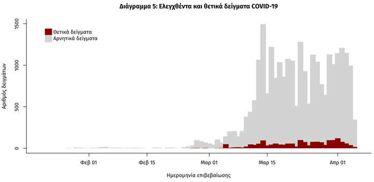 Δείγματα που έχουν ελεγχθεί στα συνεργαζόμενα με τον ΕΟΔΥ εργαστήρια: Από την 1η Ιανουαρίου 2020 μέχρι σήμερα την 6η Απριλίου στα εργαστήρια που διενεργούν ελέγχους για τον νέο κορονοϊό (SARS-CoV-2) και που δηλώνουν συστηματικά στον ΕΟΔΥ το σύνολο των δειγμάτων που ελέγχουν (θετικά και αρνητικά), έχουν συνολικά ελεγχθεί 26.193 κλινικά δείγματα, εκ των οποίων τα 1.694 (6,5%) ήταν θετικά στον κορονοϊό.