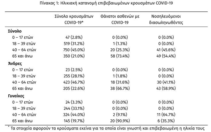 Η ηλικιακή κατανομή των συνολικών κρουσμάτων, των περιστατικών που κατέληξαν σε θάνατο και των ασθενών που νοσηλεύονται διασωληνωμένοι, αποτυπώνεται στον πίνακα: