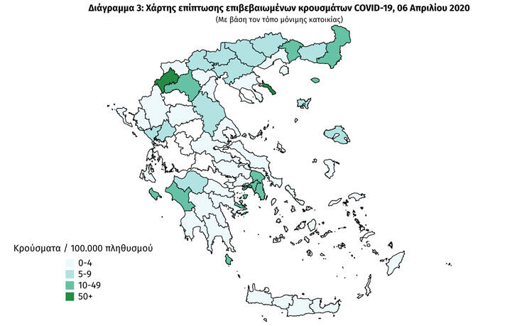 Τα στοιχεία που παρουσιάζονται αφορούν περιστατικά με βάση τα δεδομένα που έχουν δηλωθεί στον ΕΟΔΥ και καταγραφεί μέχρι τις 6 Απριλίου 2020 (ώρα 15:00).
