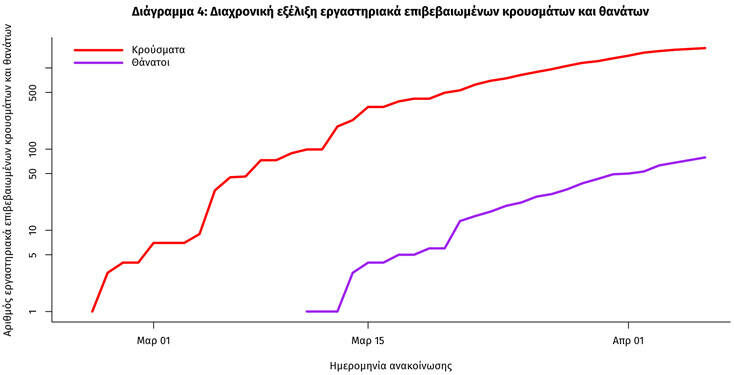 Η διαχρονική εξέλιξη των συνολικών κρουσμάτων και συνολικού αριθμού των θανάτων ασθενών COVID-19 παρουσιάζεται στο ακόλουθο διάγραμμα (σε λογαριθμική κλίμακα):