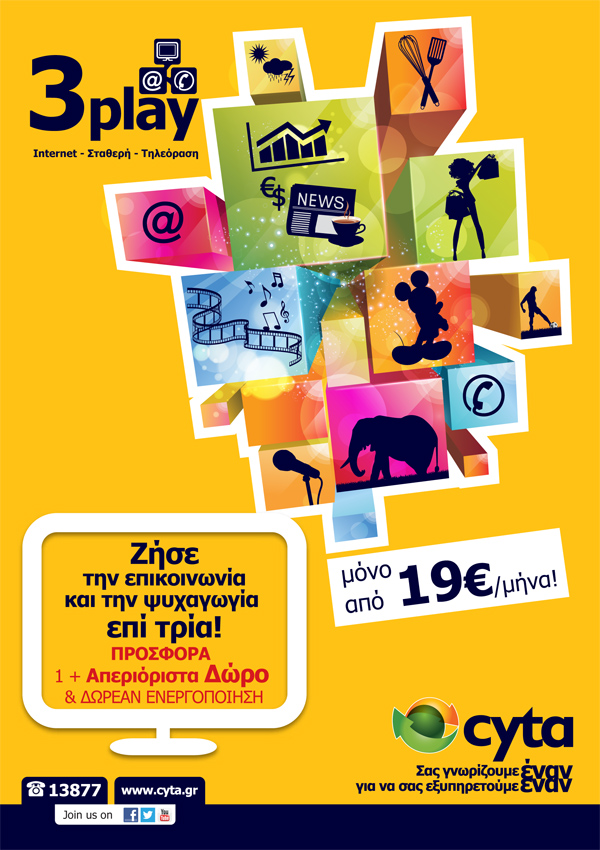 Η Cyta με σκοπό να γιορτάσει την είσοδό της στις υπηρεσίες συνδρομητικής τηλεόρασης προσφέρει, ήδη, δύο δελεαστικά, εορταστικά «πακέτα». Για περισσότερες πληροφορίες αλλά και για έλεγχο διαθεσιμότητας στην περιοχή σας, μπορείτε να επισκεφθείτε την επίσημη ιστοσελίδα της εταιρείας www.cyta.gr, να μπείτε στον επίσημο λογαριασμό της στο facebook https://www.facebook.com/cytahellasofficial, να την ακολουθήστε στο Twitter https://twitter.com/cytahellascare ή να επικοινωνήσετε με την Εξυπηρέτηση Πελατών στο 13877.