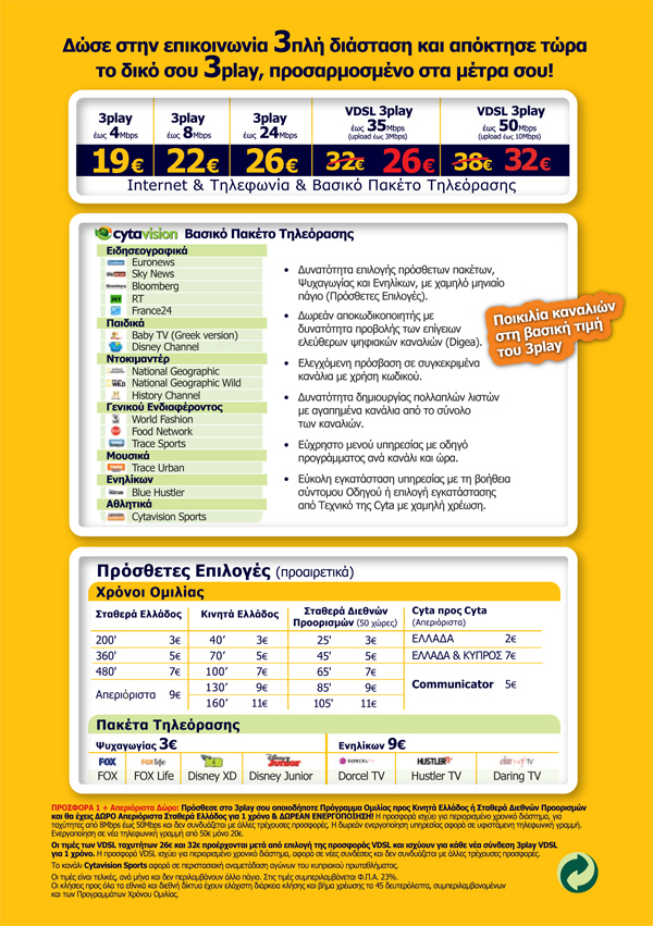 • Ταχύτητες VDSL σε τιμές ADSL. Με κάθε νέα σύνδεση στο βασικό πακέτο 3play έως 35Mbps ή έως 50Mbps έκπτωση 6 ευρώ στο μηνιαίο πάγιο για 1 χρόνο! Οι τιμές διαμορφώνονται σε 26 ευρώ/μήνα για 3play έως 35Mbps και στα 32 ευρώ/μήνα για 3play έως 50Mbps.