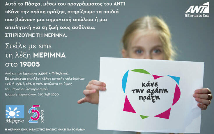 Από τις 10 Απριλίου έως και τις 26 Απριλίου, στέλνοντας με SMS τη λέξη ΜΕΡΙΜΝΑ στον πενταψήφιο αριθμό 19805 (χρέωση 2,50€ ανά SMS με ΦΠΑ από όλα τα δίκτυα κινητής τηλεφωνίας και επιπλέον επιβάρυνση 12% ή 15% ή 18% ή 20%, ανάλογα με το ύψος του μηνιαίου λογαριασμού προ ΦΠΑ, γραμμή παραπόνων: 210 7482690) στηρίζουμε τη «ΜΕΡΙΜΝΑ», μέλος της Ένωσης «Μαζί για το Παιδί». Στηρίζουμε τα παιδιά που βιώνουν μια μεγάλη απώλεια και παρόλο που δεν μπορούμε να τα απαλλάξουμε από τον πόνο που τους προκαλούν αυτές οι εμπειρίες, μπορούμε να τα βοηθήσουμε να μάθουν να τις αντιμετωπίζουν αποτελεσματικά και να τις εντάσσουν στην ιστορία της ζωής τους.