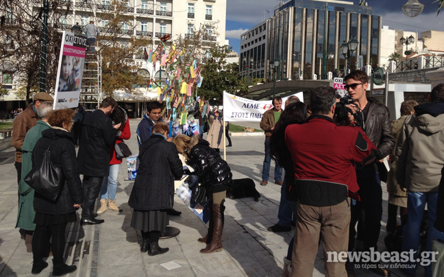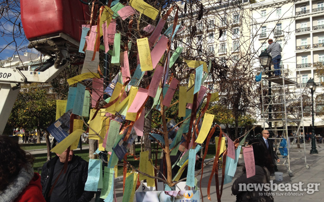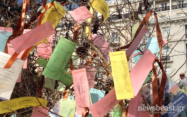 Οι διαμαρτυρόμενοι έχουν φτιάξει ένα δέντρο στολισμένο με ορισμένες από τις υπογραφές.