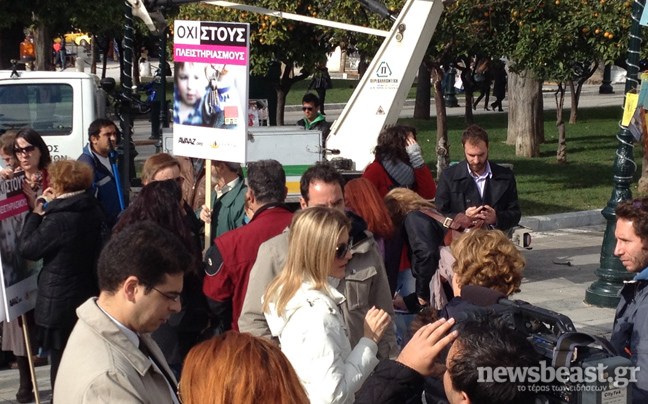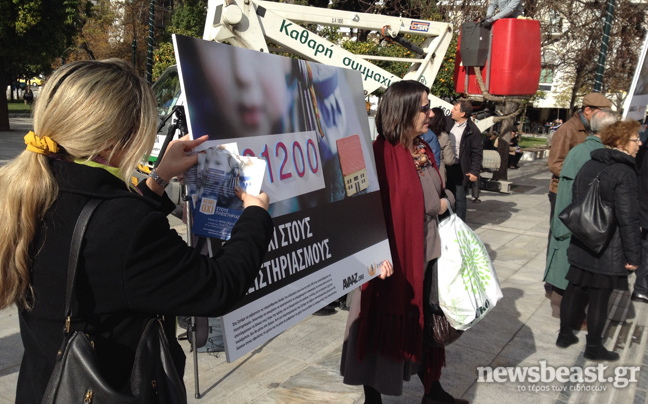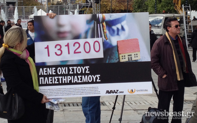 Συγκέντρωση πραγματοποιούν μέλη της Ένωσης Καταναλωτών Ποιότητας Ζωής (ΕΚΠΟΙΖΩ) στο Σύνταγμα, διαμαρτυρόμενοι για τους πλειστηριασμών των ακινήτων.
