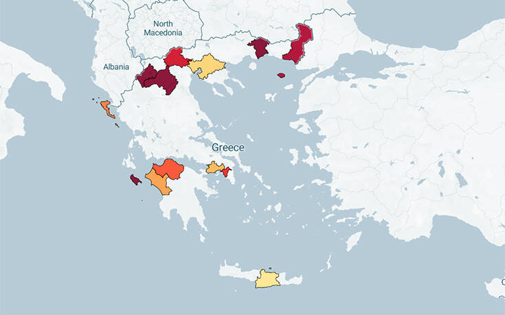 Όπως μπορείτε να δείτε στον χάρτη της Ελλάδας φαίνονται οι θάνατοι αλλά και τα κρούσματα ανά περιοχή.