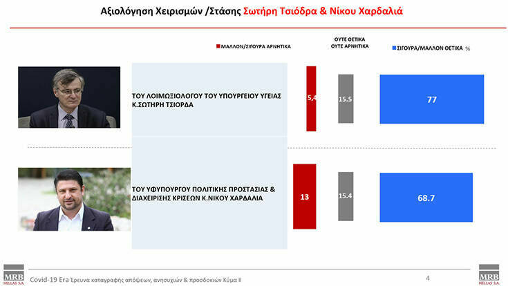 Σύμφωνα με την έρευνα, το 79,9% των πολιτών που ρωτήθηκαν θεωρούν ότι η στάση της κυβέρνησης Μητσοτάκη στο θέμα της πανδημίας λειτούργησε θετικά, έναντι 8,5% που την έκριναν αρνητικά.