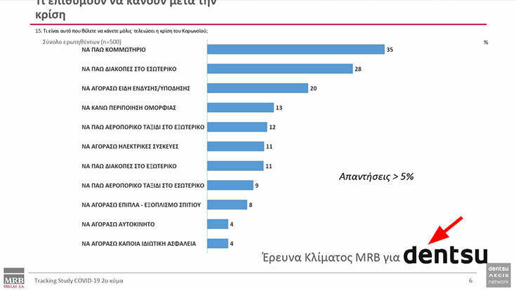 Στην έρευνα που έγινε για το κεντρικό δελτίο ειδήσεων του καναλιού, υψηλούς βαθμούς παίρνουν ο επικεφαλής λοιμωξιολόγος, εκπρόσωπος του υπουργείου Υγείας, Σωτήρης Τσιόδρας και ο υφυπουργός Πολιτικής Προστασίας Νίκος Χαρδαλιάς, ενώ σε μεγάλο απωθημένο των πολιτών αναδεικνύεται το κομμωτήριο, το οποίο εμφανίζεται πρώτο στη λίστα των πραγμάτων που θέλουν να κάνουν οι πολίτες μόλις αρθεί το lockdown και ο περιορισμός της κυκλοφορίας ως μέτρο πρόληψης για την διασπορά του ιού. Ακολουθεί το «να πάω διακοπές στο εσωτερικό», τα ψώνια και οι διακοπές.
