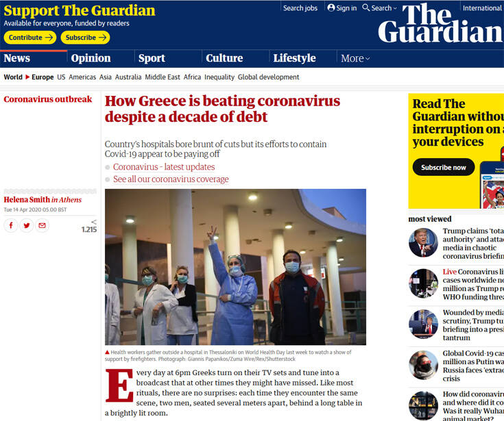 Το άρθρο έχει τίτλο «Πώς η Ελλάδα κερδίζει τη μάχη του κορονοϊού παρά τη δεκαετία του χρέους» και υπότιτλο «τα νοσοκομεία της χώρας, σήκωσαν το βάρος των περικοπών, όμως οι προσπάθειές τους να περιορίσουν τον Covid-19 φαίνεται ότι αποδίδουν».