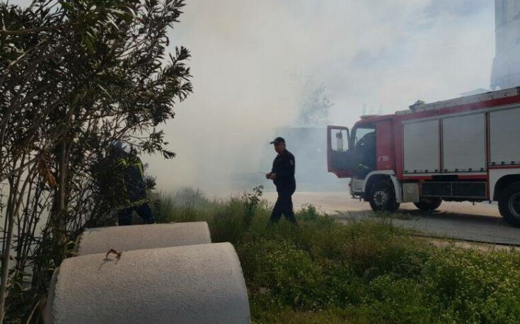 H φωτιά βρίσκεται στον εξωτερικό χώρο του εργοστασίου, όπου καίγονται παλέτες και άλλα εύφλεκτα υλικά.
