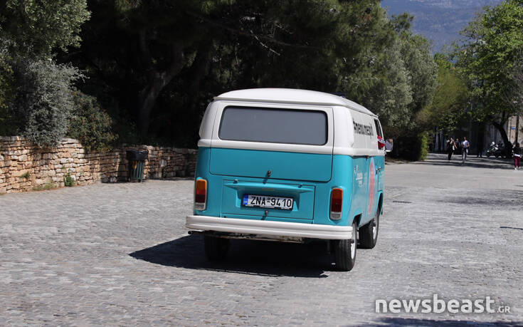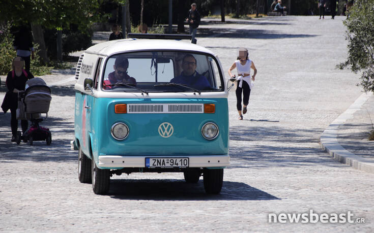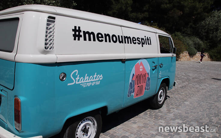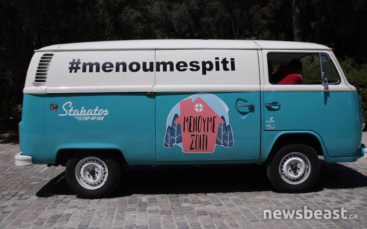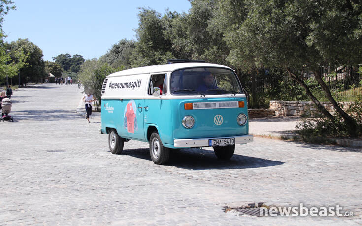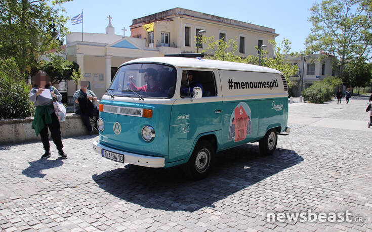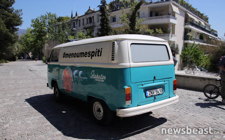 Το βανάκι κυκλοφορεί στους δρόμους της πρωτεύουσας, παίζοντας το τραγούδι «Θα κάτσω σπίτι» του Λουκιανού Κηλαηδόνη που έχει το νέο hit λόγω του ιού από τα μεγάφωνά του και μοιράζοντας ζωγραφιές στα μικρά παιδιά.