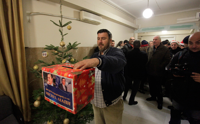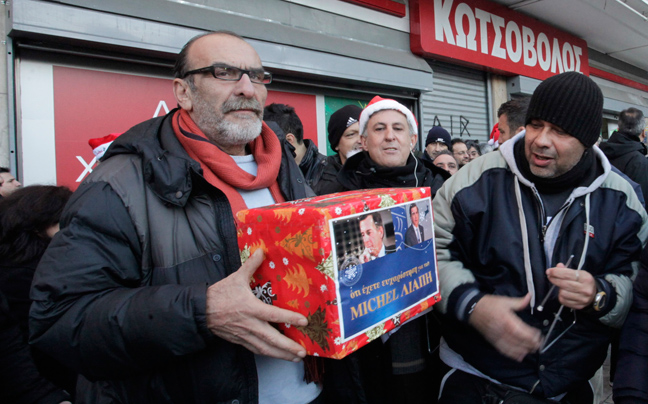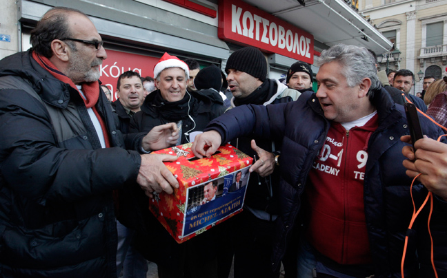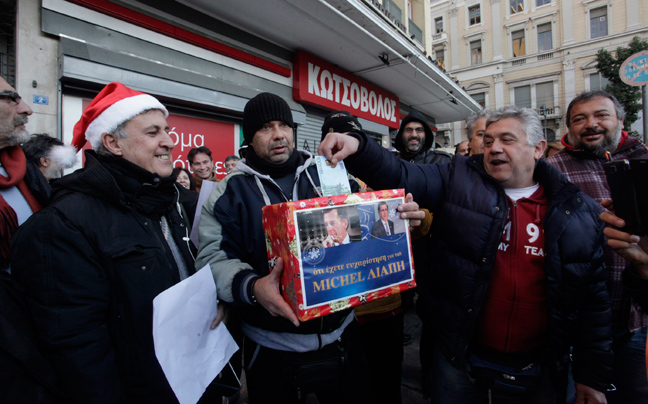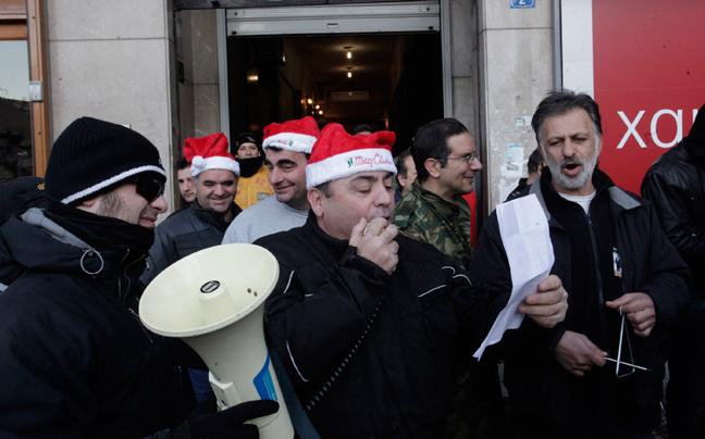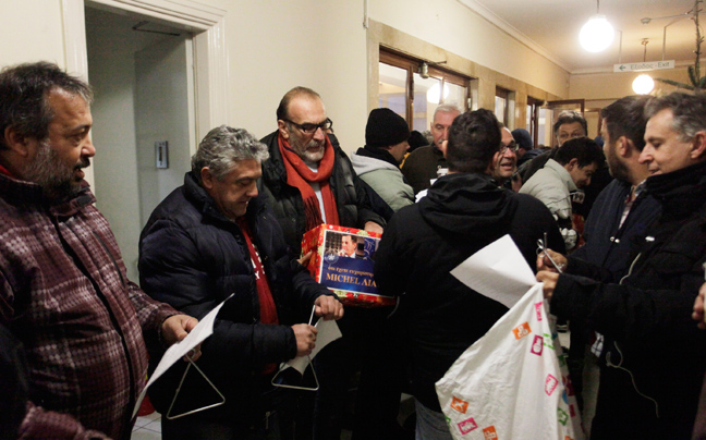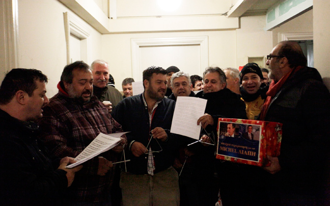 Οι συγκεντρωμένοι τραγουδούν τα κάλαντα, φωνάζουν συνθήματα, ενώ όπως τονίζουν περιμένουν τον κ. Γρηγοράκο για να του τραγουδήσουν προσωπικά τα κάλαντα.