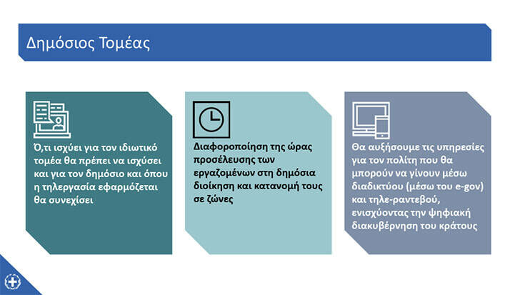 «Οι αρμόδιοι φορείς πρέπει να φροντίσουν για την ισοκατανομή του προσωπικού σε κάθε μια από αυτές τις 3 ζώνες προσέλευσης. Αντίστοιχα, προσαρμόζεται και η ώρα αναχώρησης», τόνισε.