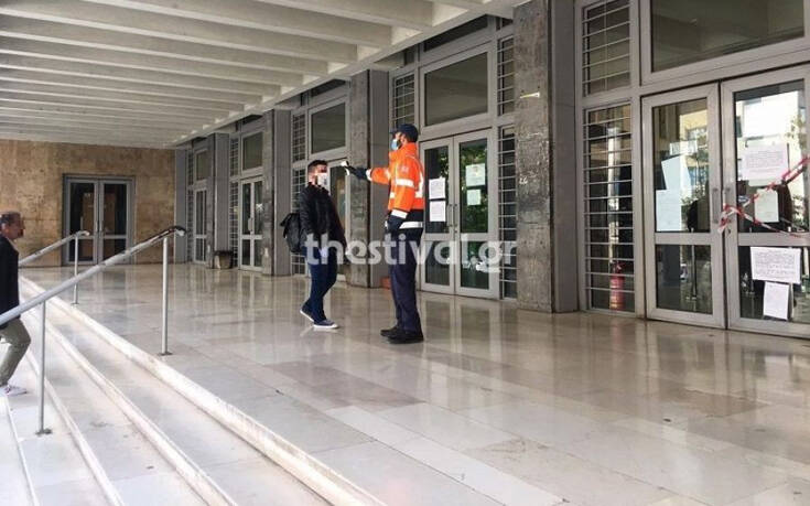 Με θερμομέτρηση στην κεντρική είσοδο εισέρχονται, από το πρωί, στο δικαστικό μέγαρο Θεσσαλονίκης, δικηγόροι, δικαστικοί λειτουργοί, υπάλληλοι, διάδικοι και πολίτες.