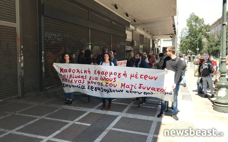 Συγκέντρωση διαμαρτυρίας πραγματοποιούν σωματεία εργαζόμενων στον πολιτισμό έξω από το υπουργείο Εργασίας.