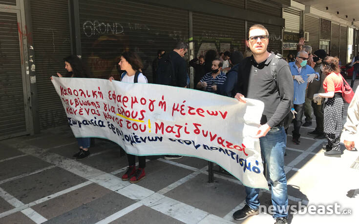 Οι διαμαρτυρόμενοι κρατούν πανό και ζητούν να συμπεριληφθούν στα μέτρα λόγω κορονοϊού και να λάβουν επίδομα όσοι εργάζονται στην τέχνη.