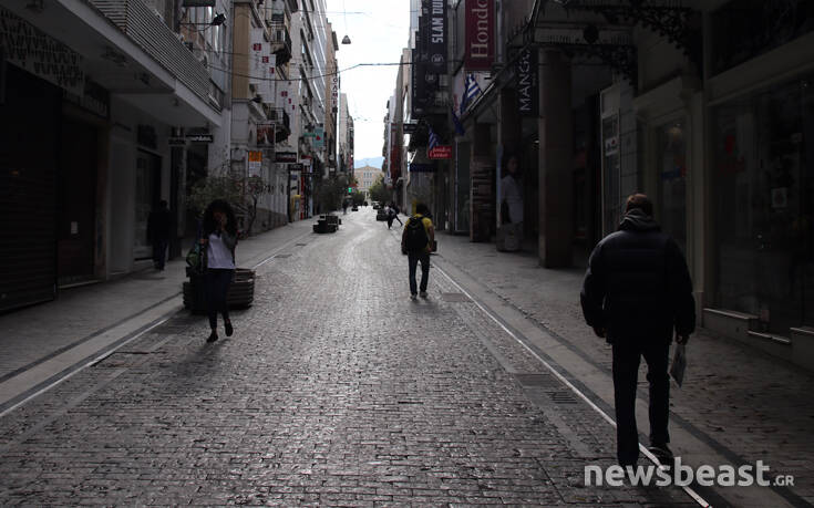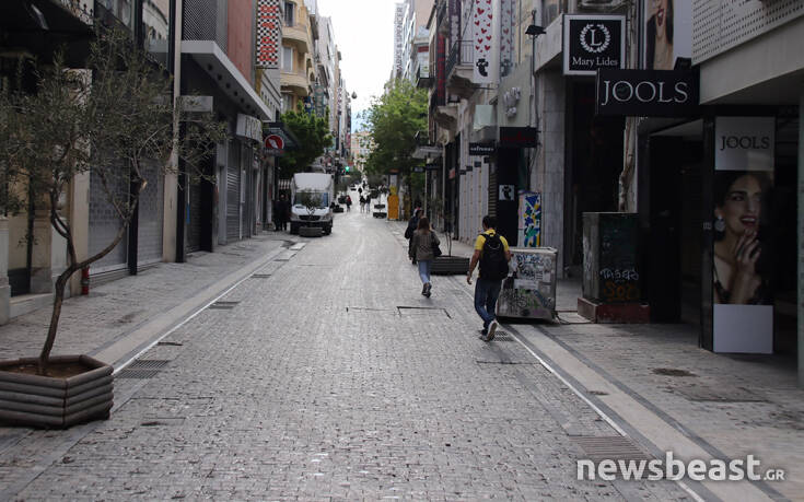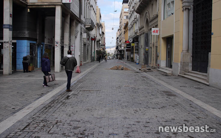 Οι πρώτες εικόνες από την οδό Ερμού δείχνουν πολύ μικρή διαφορά στην κίνηση, που μάλλον θα αλλάξει σημαντικά με το δεύτερο κύμα ανοίγματος καταστημάτων, την επόμενη Δευτέρα.
