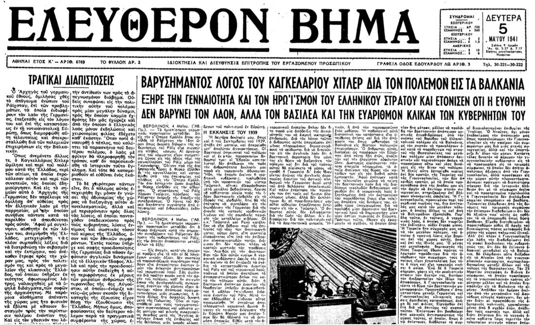 Από την πλευρά του το «Ελεύθερον Βήμα» κάνει λόγο για «βαρυσήμαντο λόγο του καγκελάριου Χίτλερ διά τον πόλεμον εις τα Βαλκάνια» και στον υπότιτλο αναφέρει ότι «εξήρε την γενναιότητα και τον ηρωισμόν του ελληνικού στρατού και ετόνισεν ότι η ευθύνη δεν βαρύνει τον λαόν, αλλά τον βασιλέα και την ευάριθμον κλίκαν των κυβερνητών του».