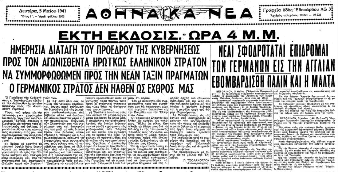 Έτσι λοιπόν τα «Αθηναϊκά Νέα» της 5ης Μαΐου 1941 είχαν ως κεντρικό τίτλο: «Ο χθεσινός ιστορικός λόγος του καγκελάριου Χίτλερ ύμνος προς τον ηρωισμόν του Έλληνος στρατιώτου. Η ήττα βαρύνει τον βασιλέα και την κλίκαν του». Η ίδια εφημερίδα μια ημέρα μια ημέρα νωρίτερα είχε ως πρώτο θέμα την «επιβλητική παρέλαση των γερμανικών στρατευμάτων και ιταλικών δυνάμεων κατοχής» μπροστά από το μνημείο του Άγνωστου Στρατιώτη στην πλατεία Συντάγματος.