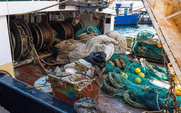 Δίχτυα και πλαστικό που η Εναλεία “ψάρεψε” απο τη θάλασσα με ένα από τα συνεργαζόμενα καίκια της
