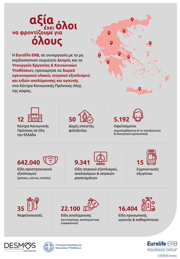 Συνολικά, μέσω της δωρεάς του Ομίλου Eurolife ERB, έχουν διατεθεί για χρήση από το ιατρικό και νοσηλευτικό προσωπικό των Κέντρων Κοινωνικής Πρόνοιας 9.341 είδη ιατρικών μηχανημάτων, ιατρικού εξοπλισμού και αναλώσιμων, καθώς και 642.040 είδη ατομικού προστατευτικού εξοπλισμού, όπως μάσκες, γάντια και στολές εργασίας. Επίσης, έχουν διαμοιραστεί 22.100 είδη απολύμανσης και 16.404 είδη καθαριότητας και προσωπικής υγιεινής, όπως αντισηπτικά και απολυμαντικά, για την καλύτερη περιποίηση των χώρων, στους οποίους φιλοξενούνται ευπαθείς ομάδες υψηλού κινδύνου.