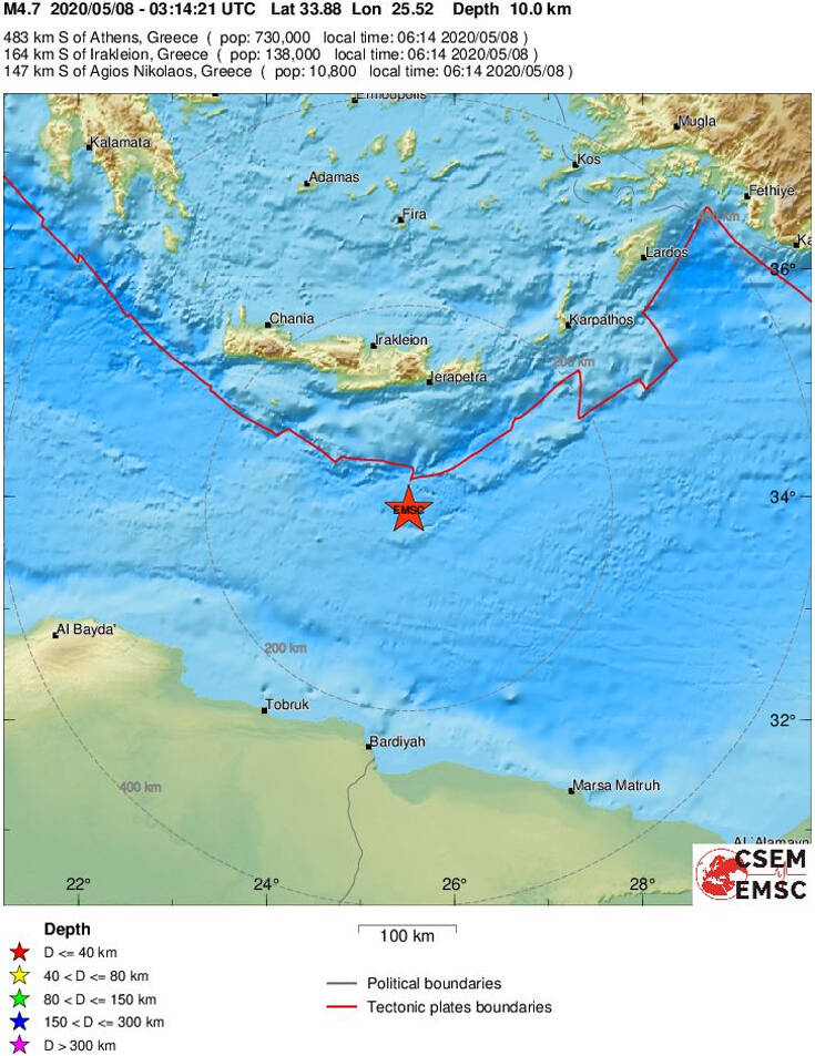Το ακριβές επίκεντρο τη δόνησης εντοπίζεται στα 164 χλμ. νότια του Ηράκλειου Κρήτης.