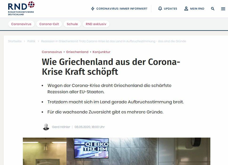 Υπό τον τίτλο «Πώς η Ελλάδα αντλεί δύναμη από την κρίση του κορονοϊού», το δίκτυο εφημερίδων «Redaktionsnetzwerk Deutschland» δημοσιεύει ανταπόκριση από την Αθήνα, στην οποία o συντάκτης, βασιζόμενος στα στοιχεία έρευνας, επισημαίνει ότι, παρά τις δυσοίωνες προβλέψεις για την οικονομία, στην Ελλάδα «υπάρχει πνεύμα αισιοδοξίας».