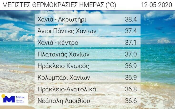 Παράλληλα, η μέγιστη θερμοκρασία έφθασε τους 38,4 βαθμούς στο Ακρωτήρι Χανίων, τους 37,4 στους Αγίους Πάντες Χανίων, τους 37 στο κέντρο των Χανίων, τους 37 στον Πλατανιά Χανίων και τους 36,9 στην Κνωσό Ηρακλείου.