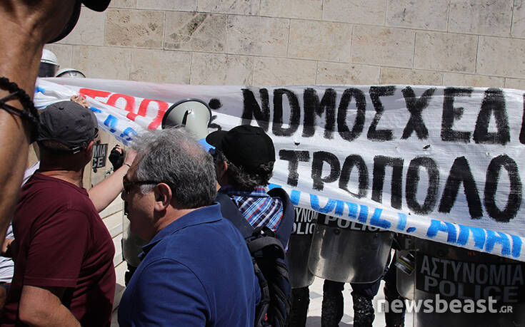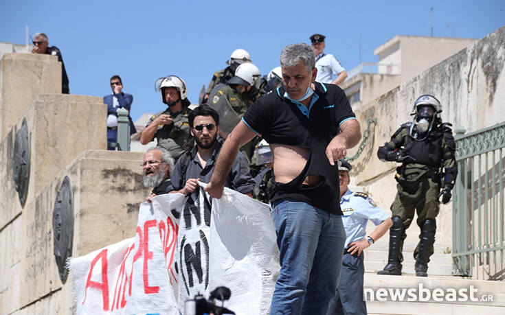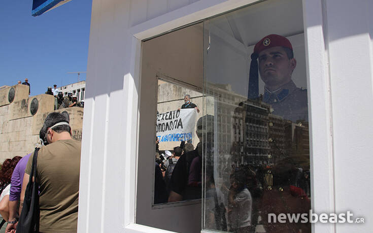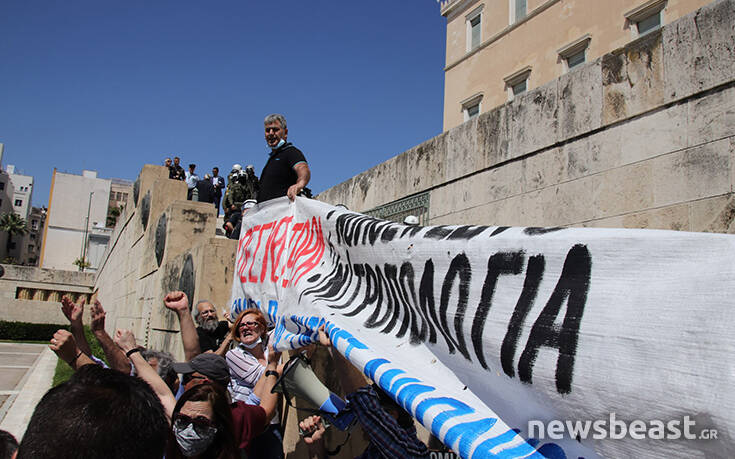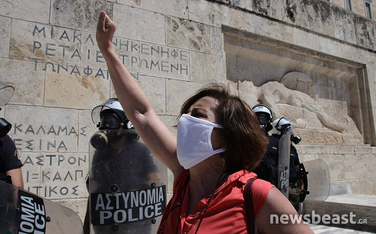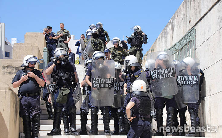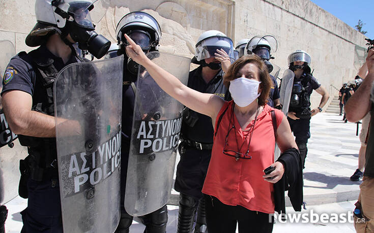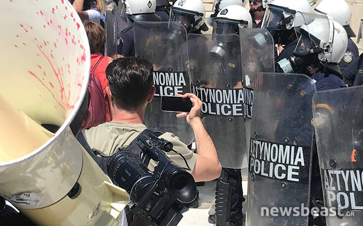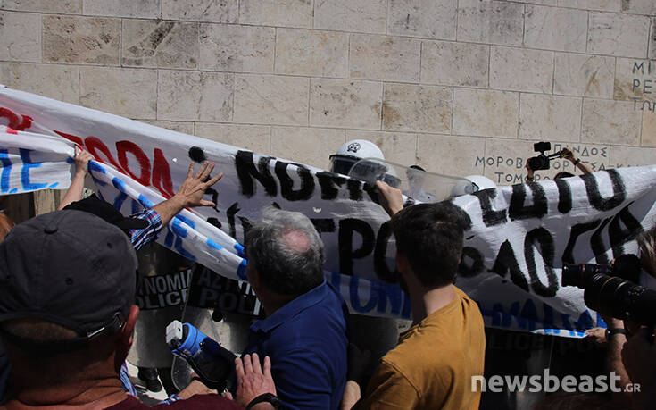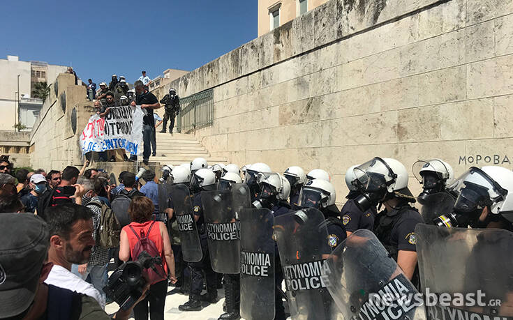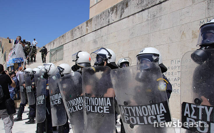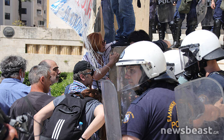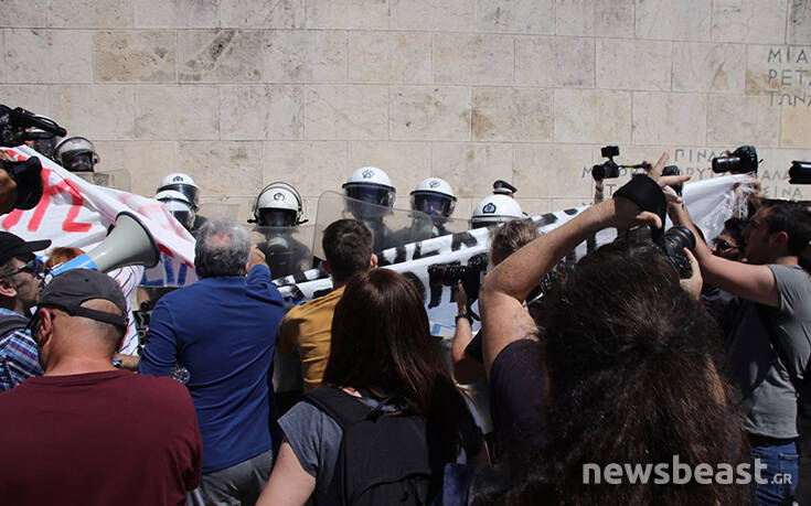 Οι διαδηλωτές προσπάθησαν να ανέβουν τα σκαλιά στο μνημείο του Αγνώστου Στρατιώτη για να τοποθετήσουν ένα πανό με αποτέλεσμα οι δυνάμεις της Αστυνομίας να τους απωθήσουν σπρώχνοντάς τους.