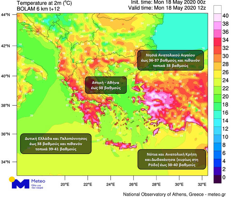 Πολύ υψηλές μέγιστες θερμοκρασίες θα σημειωθούν στη Δυτική και στη Νότια Ελλάδα (ιδιαίτερα στη Νότια Πελοπόννησο όπου τοπικά το μεσημέρι μπορεί το θερμόμετρο να δείξει 39 έως 41 βαθμούς), στην Ανατολική και Νότια Κρήτη και στα Δωδεκάνησα, κυρίως στη Ρόδο (με θερμοκρασίες έως 38-40 βαθμούς), καθώς και στην Αττική (έως 38 βαθμούς).