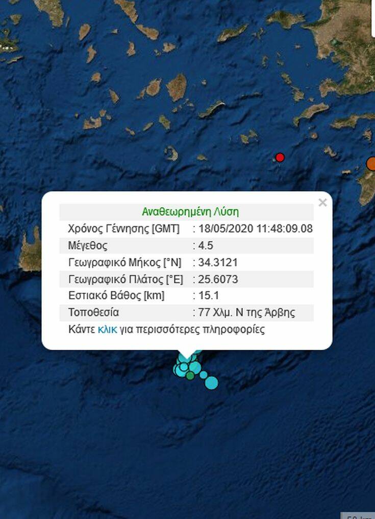 Νέος σεισμός 4,5 Ρίχτερ καταγράφηκε στις 14:48 με επίκεντρο στο θαλάσσιο χώρο 77 χιλιόμετρα νότια της Άρβης του Δήμου Βιάννου.