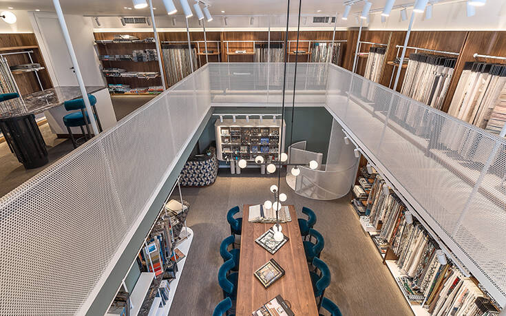Με κυρίαρχα στοιχεία το ζεστό ξύλο της καρυδιάς, το ενιαίο πλεκτό δάπεδο, τα λεπτά μεταλλικά στοιχεία, τους κρυφούς φωτισμούς και το μεγάλο κεντρικό τραπέζι, που δεσπόζει κάτω από μια κεντρική οπή που ενοποιεί το χώρο, οι καινοτόμες συλλογές υφασμάτων της Sarlas Contracts ζωντανεύουν και δίνουν έμπνευση για μοναδικές δημιουργίες. Ανακαλύψτε στο ισόγειο και το πρώτο επίπεδο τις διώροφες βιβλιοθήκες υφασμάτων, που καταλαμβάνουν όλο το ύψος του καταστήματος, και περιηγηθείτε μέσα από τον κρεμαστό διάδρομο σε έναν κόσμο με μοναδικά χρώματα, στυλ και υφές.