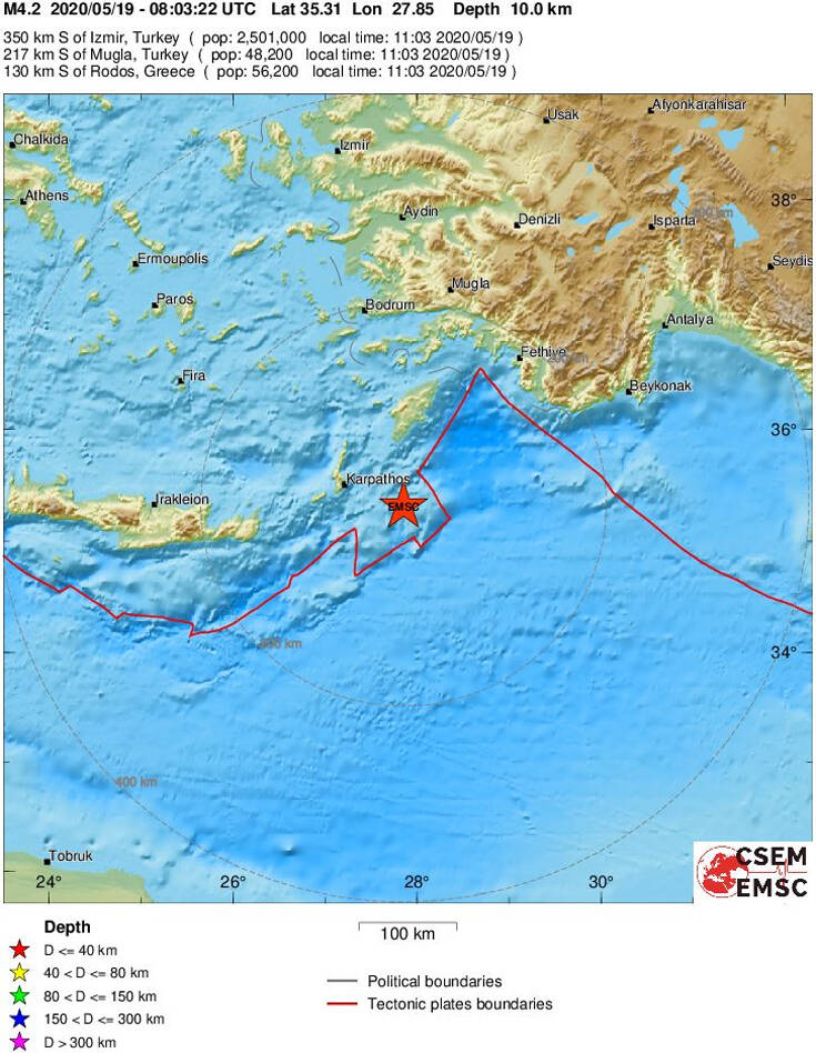 Ο σεισμός έγινε σε απόσταση 472 χιλιόμετρα νοτιοανατολικά της Αθήνας και το επίκεντρο εντοπίζεται στον θαλάσσιο χώρο 64 χιλιόμετρα ανατολικά/νοτιανατολικά της Καρπάθου.