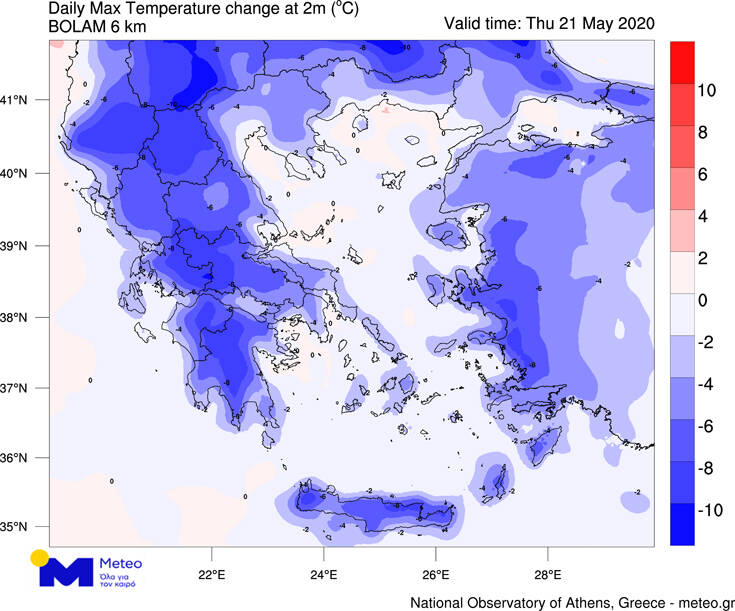 Παράλληλα, σημαντική πτώση θα παρουσιάσει η θερμοκρασία σε ολόκληρη τη χώρα με τις μέγιστες θερμοκρασίες την Πέμπτη 21/05 να είναι έως και 10 βαθμούς χαμηλότερες σε σχέση με τα επίπεδα της Τετάρτης 20/05 όπως φαίνεται στον προγνωστικό χάρτη μεταβολής της θερμοκρασίας.