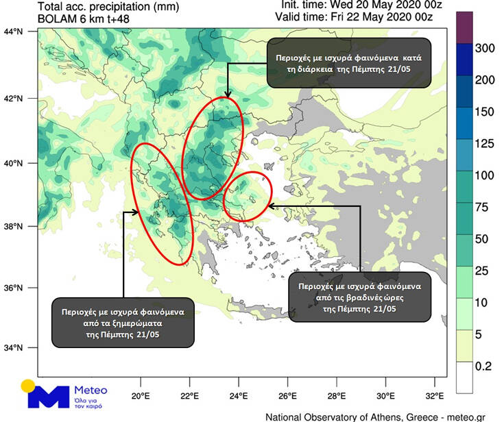 Κατά τη διάρκεια της Πέμπτης 21/05 ισχυρές βροχές και καταιγίδες θα εκδηλωθούν σε μεγάλο μέρος της ηπειρωτικής χώρας, συμπεριλαμβανομένης της Θεσσαλονίκης, φαινόμενα που μέχρι το βράδυ της Πέμπτης θα επεκταθούν στην Εύβοια, στις Σποράδες και ενδεχομένως στη Βόρεια Αττική.