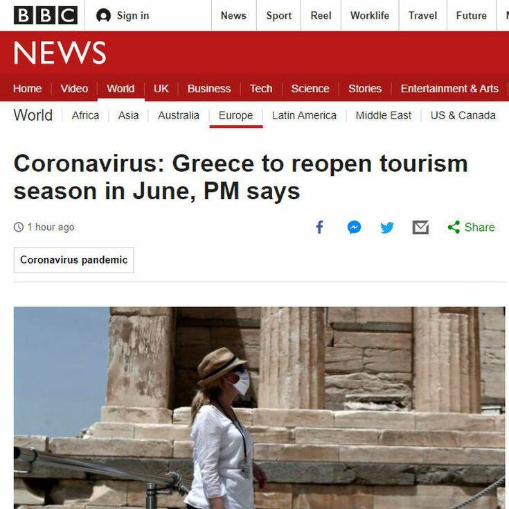 Το BBC, τονίζοντας πως η πανδημία απειλεί να καταστρέψει την ελληνική τουριστική βιομηχανία, αναφέρεται και στην δήλωση του Έλληνα πρωθυπουργού «όπως κερδίσαμε τη μάχη της υγείας, θα νικήσουμε και στον πόλεμο της οικονομίας».