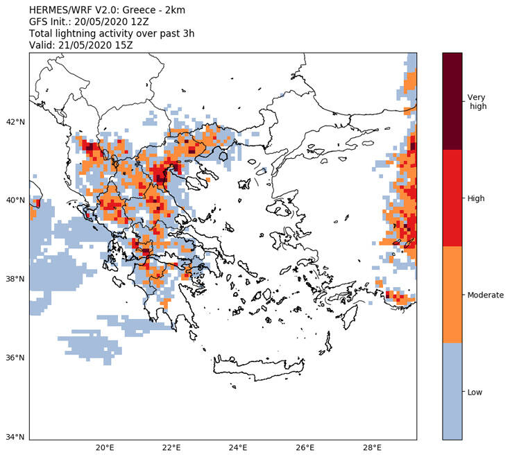 Σύμφωνα με το σύστημα πρόγνωσης κεραυνών TALOS, οι καταιγίδες που θα εκδηλωθούν την Πέμπτη 21/05 θα παρουσιάσουν αυξημένη κεραυνική δραστηριότητα, όπως φαίνεται στο ακόλουθο προγνωστικό χάρτη.