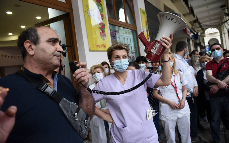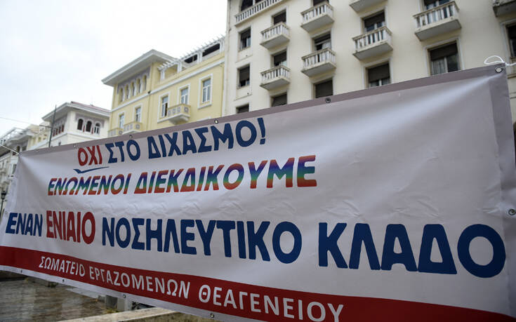 Διαμαρτυρία έξω από τα γραφεία της 3ης και της 4ης Υγειονομικής Περιφέρειας (ΥΠΕ) στην πλατεία Αριστοτέλους πραγματοποίησαν νοσηλευτές και νοσηλεύτριες δημοσίων νοσοκομείων της Θεσσαλονίκης, στο πλαίσιο της πανελλαδικής κινητοποίησης της ΠΟΕΔΗΝ. Ακολούθησε πορεία μέχρι το ΥΜΑΘ.