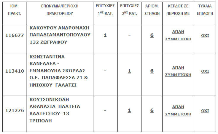 Επίσης, στη δεύτερη κατηγορία (5+1) βρέθηκαν δύο τυχερά δελτία που κερδίζουν 50.000 ευρώ το καθένα. Παρακάτω ο πίνακας με τις επιτυχίες στην κλήρωση του Σαββάτου: