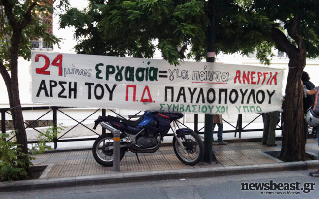 Οι συμβασιούχοι έχουν αποκλείσει την είσοδο του κτιρίου και έχουν καταλάβει την οδό Μπουμπουλίνας, με αποτέλεσμα η κυκλοφορία των αυτοκινήτων να έχει διακοπεί.