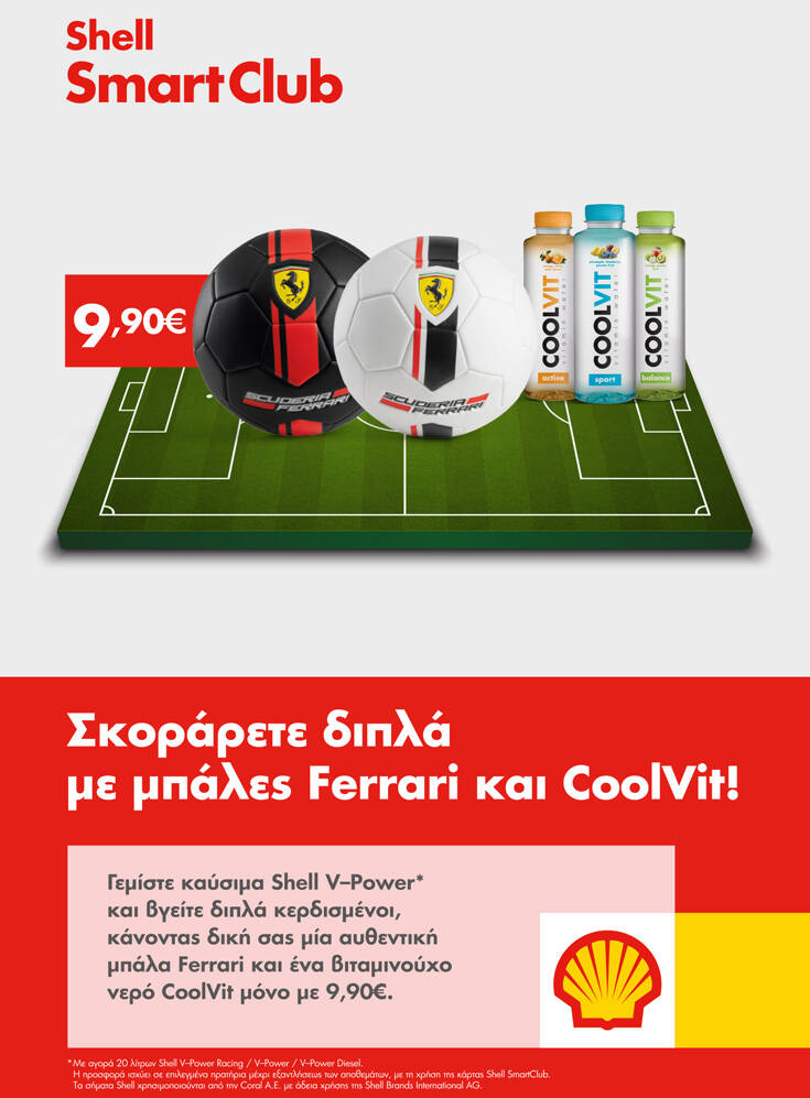 Από σήμερα, κάθε καταναλωτής που επιλέγει τα πρατήρια καυσίμων Shell για τον ανεφοδιασμό του οχήματός του, έχει τη δυνατότητα να αποκτήσει μια αυθεντική μπάλα Ferrari, καθώς κι ένα βιταμινούχο νερό CoolVit.