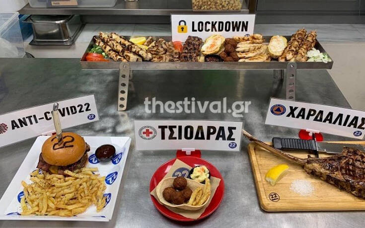 Ο πάντα ευφυής και δημιουργικός, Δημήτρης Εικοσιδυός, ιδιοκτήτης του ψητοπωλείου «22» στην Αριστοτέλους, προσφέρει κεφτεδάκια Τσιόδρας, μπριζόλα Χαρδαλιάς και μπέργκερ ειδικό… για τον κορονοϊό.