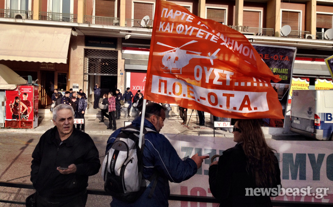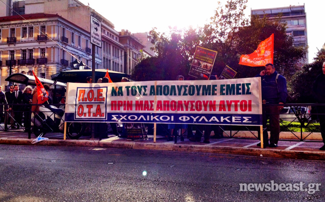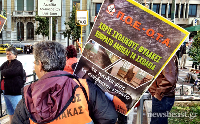 Σχολικοί φύλακες με την πρωτοβουλία της ΠΟΕ-ΟΤΑ διαμαρτύρονται στην πλατεία Κλαυθμώνος.
