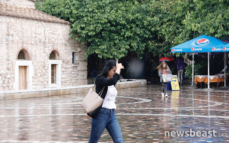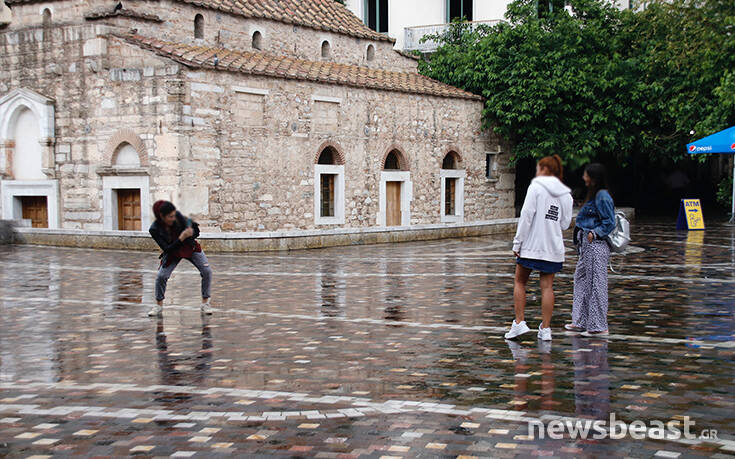 Κάποιοι προνόησαν και είχαν πάρει ομπρέλα μαζί τους, άλλοι, όπως φαίνεται και στις φωτογραφίες, βράχηκαν ή έβαλαν μια σακούλα στο κεφάλι για να προστατευτούν και κάποιοι το χάρηκαν πολύ, ποζάροντας στη βροχή!