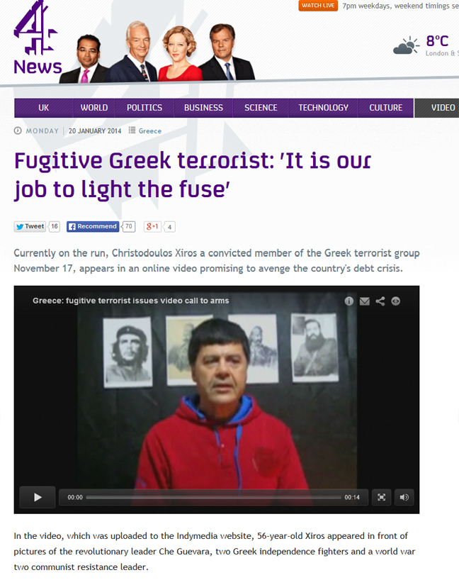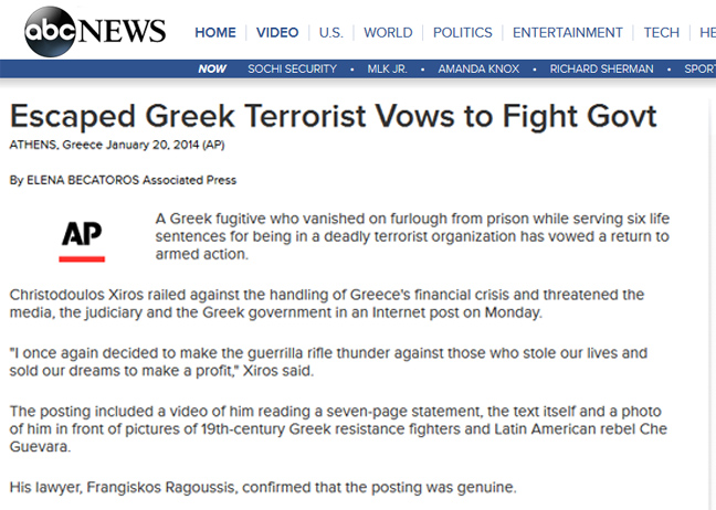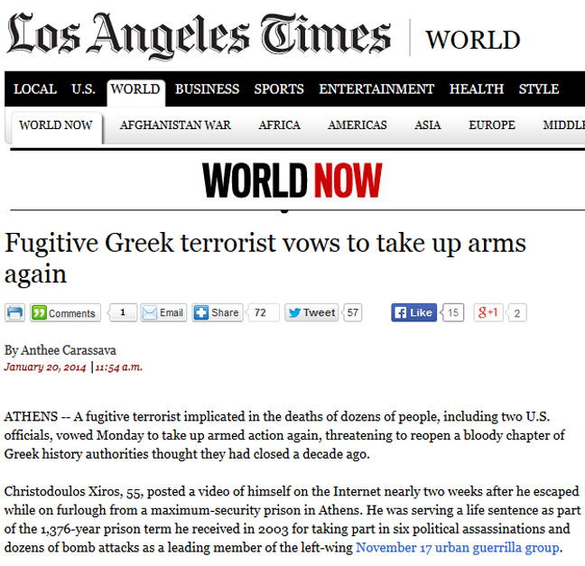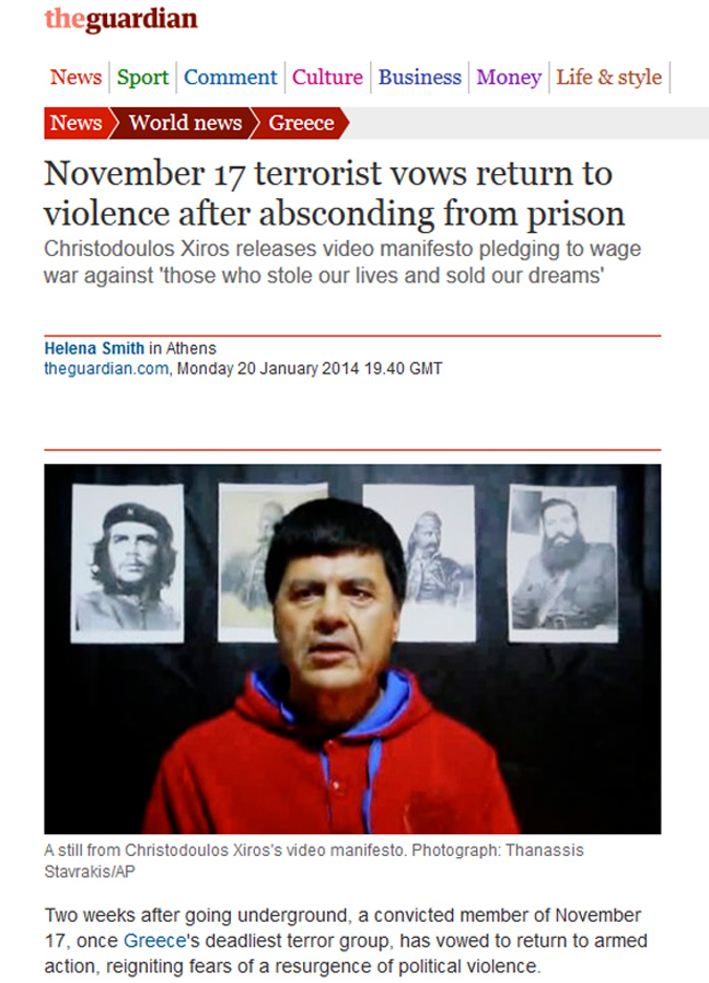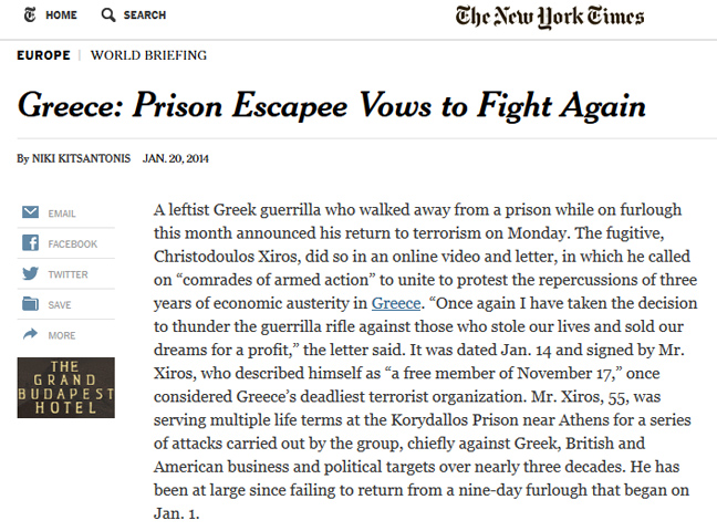 «Αριστεριστής έλληνας αντάρτης που διέφυγε από τη φυλακή ανακοίνωσε τη Δευτέρα την επιστροφή του στην τρομοκρατία. Ο φυγάς Χριστόδουλος Ξηρός με βίντεο στο διαδίκτυο και επιστολή, καλεί “τους συντρόφους του ένοπλου αγώνα” να ενωθούν για να διαμαρτυρηθούν ενάντια στις επιπτώσεις των τριών χρόνων σκληρής λιτότητας στην Ελλάδα» τονίζουν οι New York Times.