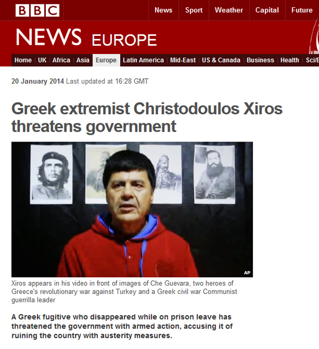 «Έλληνας φυγάς που εξαφανίστηκε παραβιάζοντας την άδεια από τις φυλακές απειλεί με ένοπλη δράση την κυβέρνηση και την κατηγορεί ότι κατέστρεψε τη χώρα με τα μέτρα λιτότητας. Ο Χριστόδουλος Ξηρός, που είχε καταδικαστεί σε φυλάκιση το 2003 για συμμετοχή στην τρομοκρατική οργάνωση 17 Νοέμβρη, έχει υποσχεθεί να ξαναπιάσει τα όπλα», αναφέρει το BBC.