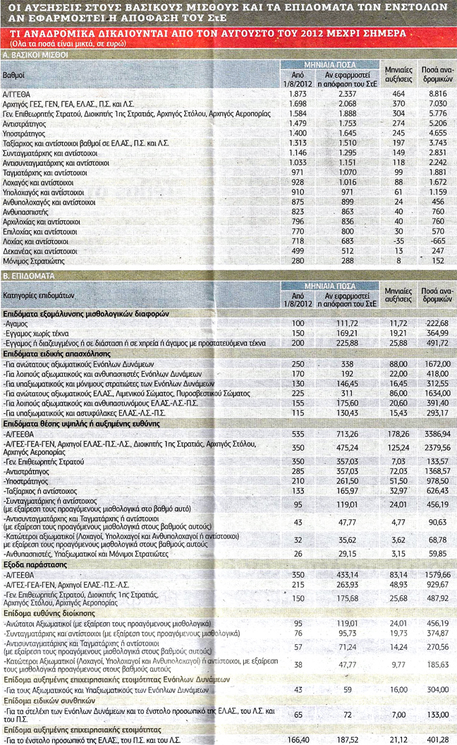 Εάν επανέλθουν πλήρως μισθοί και επιδόματα στα επίπεδα του Ιουλίου του 2012 τότε οι ένστολοι θα πρέπει να περιμένουν εκτός από την αύξηση στον βασικό μισθό και αύξηση στο επίδομα εξομάλυνσης, στο επίδομα ειδικής απασχόλησης, στο επίδομα θέσης και αυξημένης ευθύνης, αλλά και στα επιδόματα αυξημένης επιχειρησιακής ετοιμότητας και ειδικών συνθηκών, όπως και στα επιδόματα που αφορούν στη διοίκηση μονάδων.