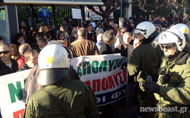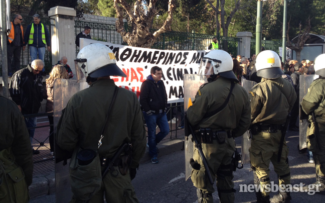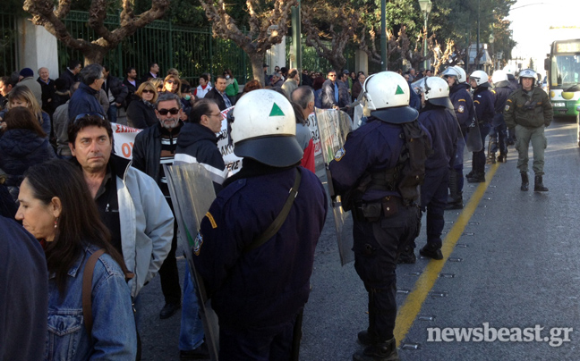 Η αστυνομία έχει περικυκλώσει τους συγκεντρωμένους, οι οποίοι βρίσκονται στο λεωφορειόδρομο της Βασιλίσσης Σοφίας, ζητώντας τους να συνεχίσουν τη διαμαρτυρία τους στο πεζοδρόμιο.