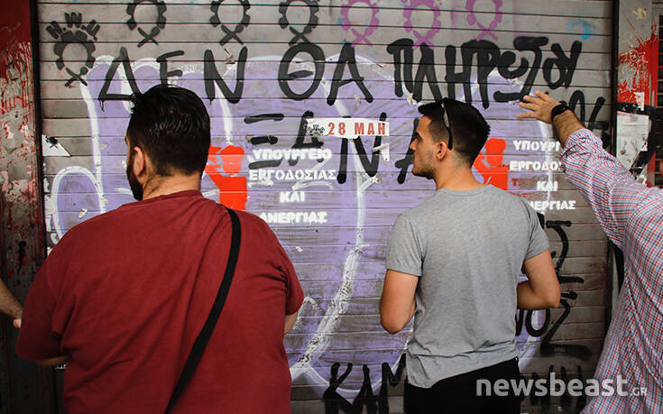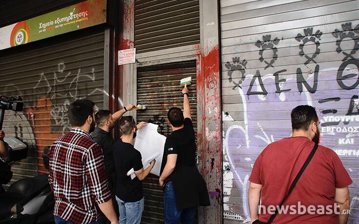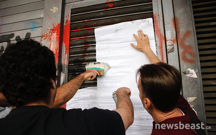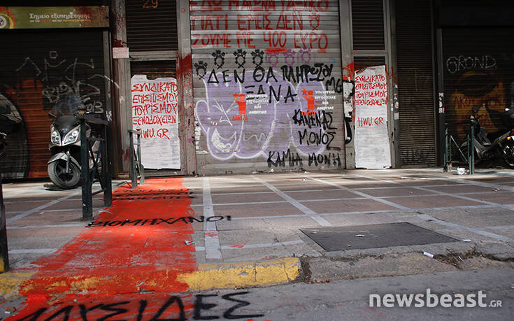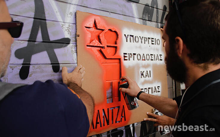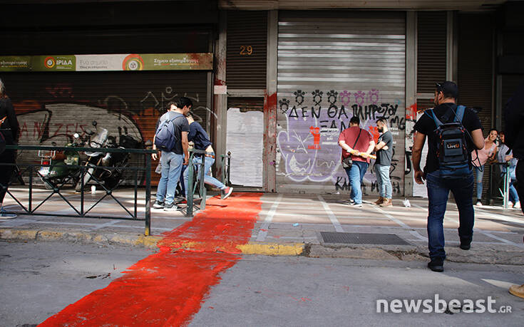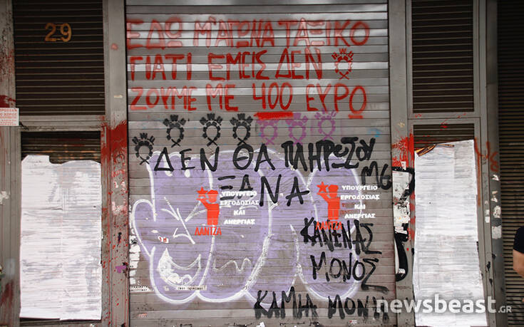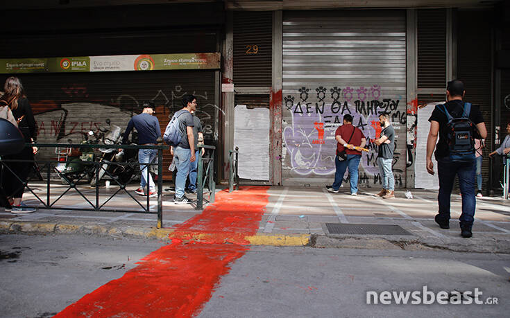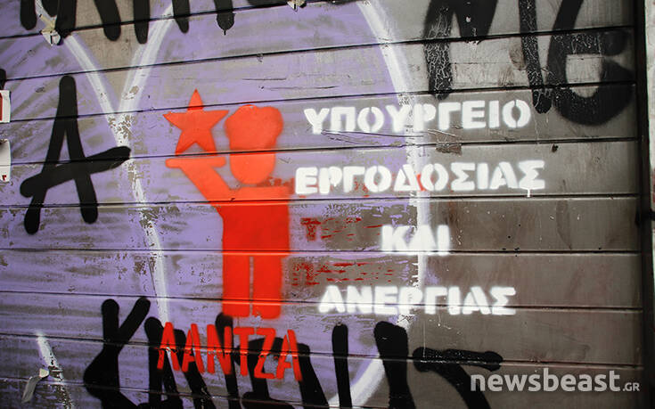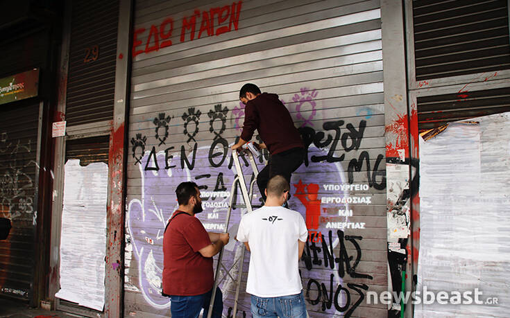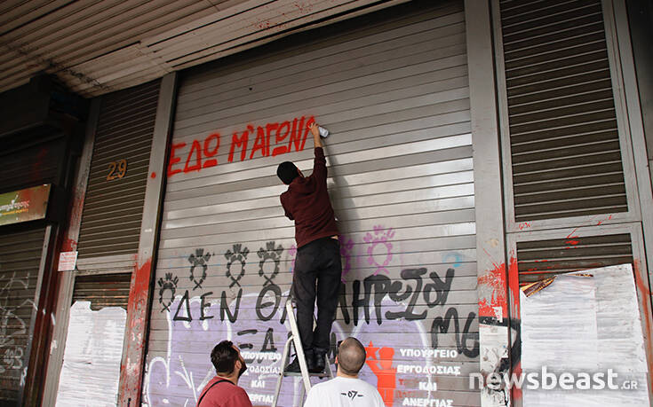 Η οδός Σταδίου είχε νωρίτερα κλείσει στο ύψος του υπουργείου Εργασίας και οι διαδηλωτές τοιχοκόλλησαν αφίσες στην είσοδο του κτιρίου, μπροστά στις αστυνομικές δυνάμεις.