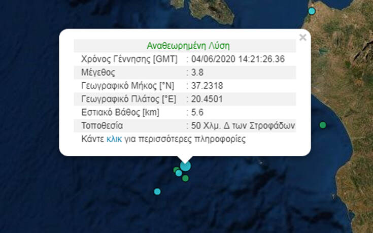 Σύμφωνα με το Γεωδυναμικό Ινστιτούτο το επίκεντρο βρίσκεται στον θαλάσσιο χώρο 46 χιλιόμετρα δυτικά των Στροφάδων με εστιακό βάθος στα 10 χιλιόμετρα.